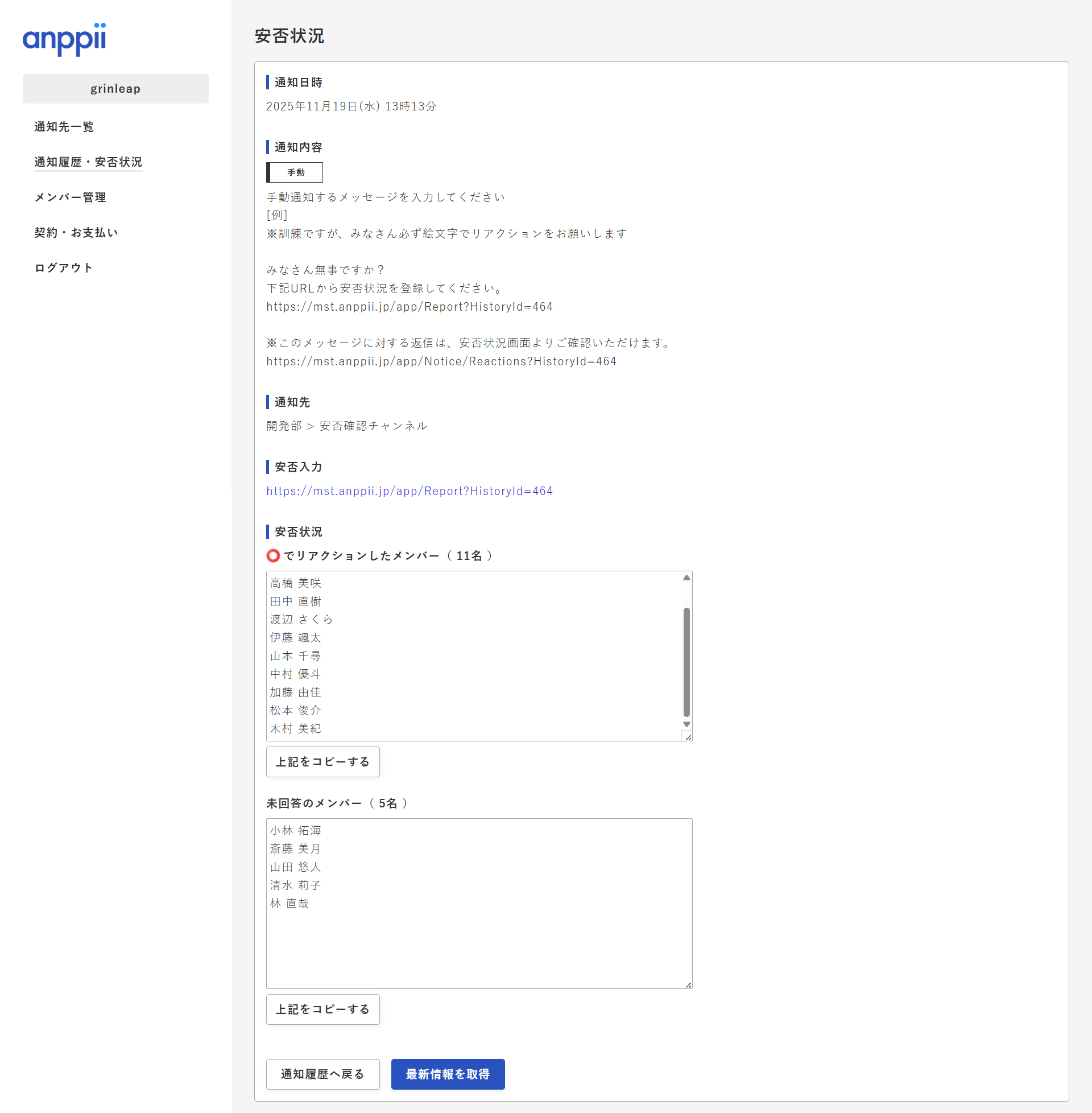 ②対象の安否状況を確認でき、必要に応じてコピーボタンをご利用できます。