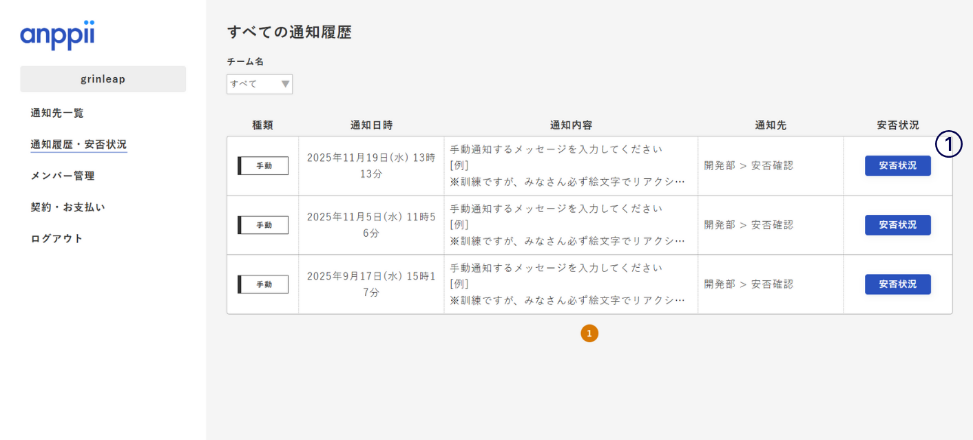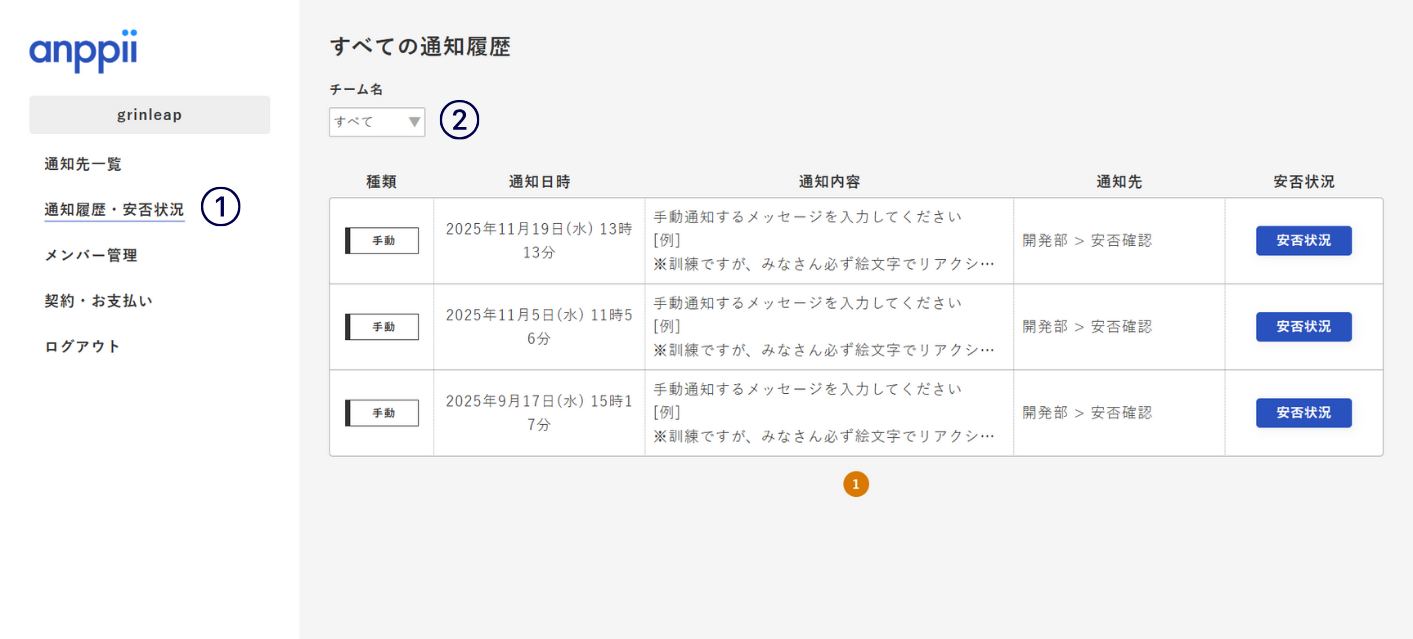 ①共通メニューの「通知履歴・安否状況」リンクをクリックすると、通知履歴が表示されます。