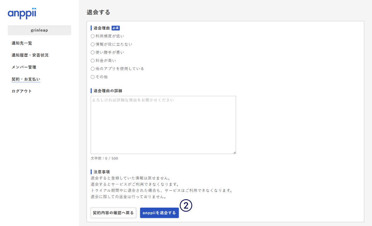 退会について 2025.11.272025.11.28退会の流れ①共通メニューの「契約・お支払い」リンクをクリック後、下部にある「退会」リンクをクリックしてください。②退会理由を選択・記入後、「退会する」ボタンをクリックしてください。③「anppiiを退会しました。」画面が表示されたら、退会完了です。