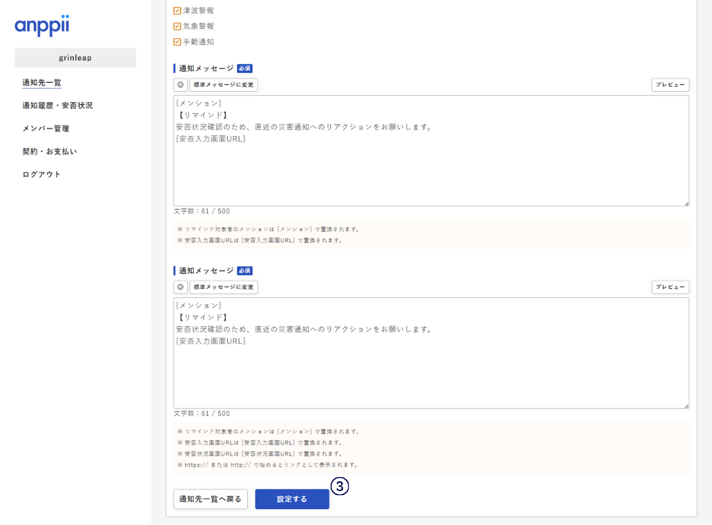 ③リマインドしたい通知時間を選択し、通知メッセージを編集後、「設定する」ボタンをクリックしてください。